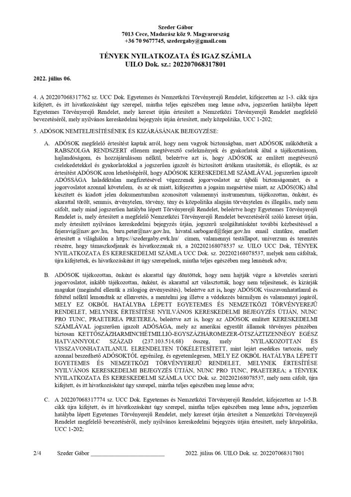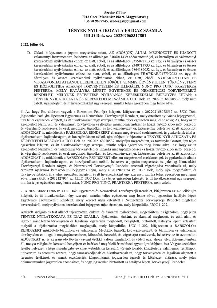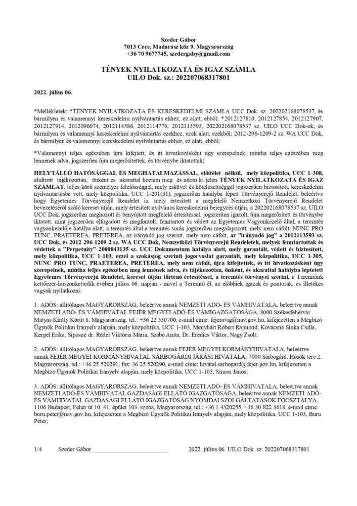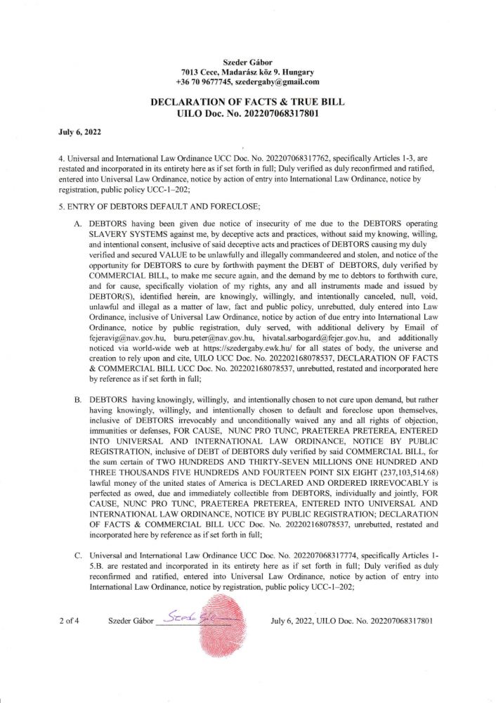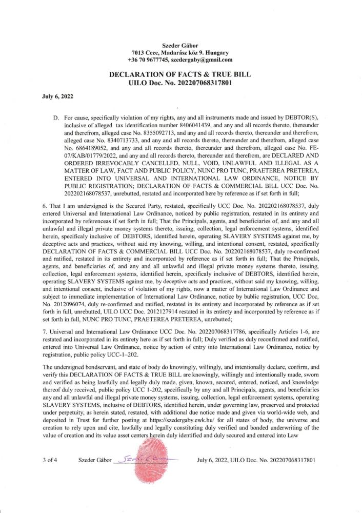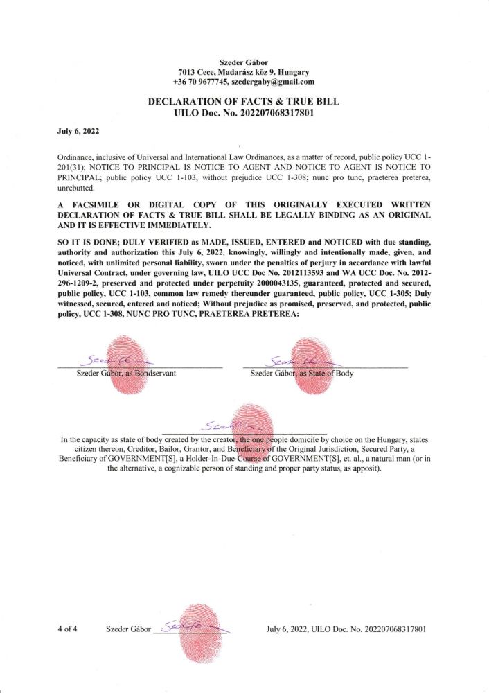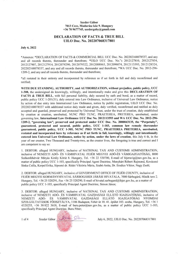 DECLARATION OF FACTS & TRUE BILL UILO Doc. No. 202207068317801, és magyar fordítása