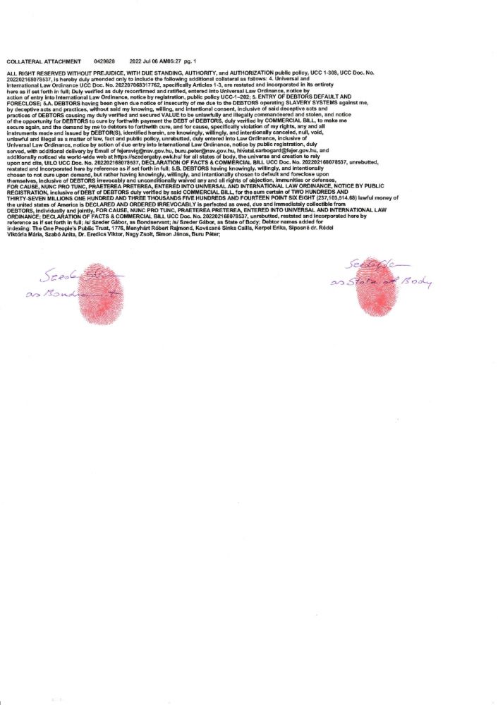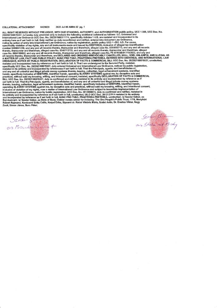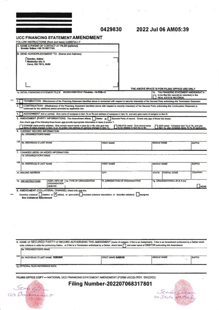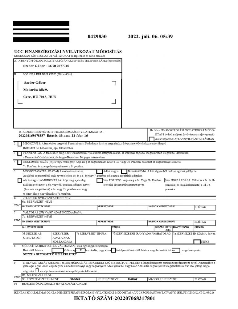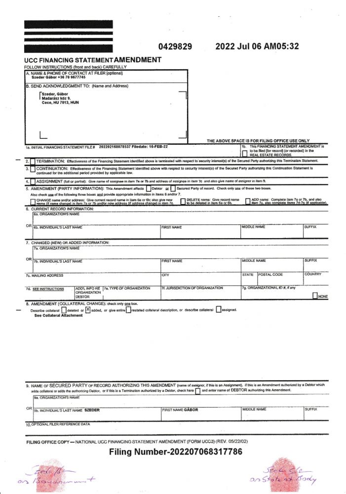 202207068317786 sz. UCC FINANCING STATEMENT AMENDMENT (UCC FINANSZÍROZÁSI NYILATKOZAT MÓDOSÍTÁS) (UCC Dok.), és annak elfogadása ("irányadó jog”: 2012-296-1209-2 sz. WA UCC Dok.: „..Ez az egyetlen elfogadás, amit kap…”), és ezek magyar fordításai: