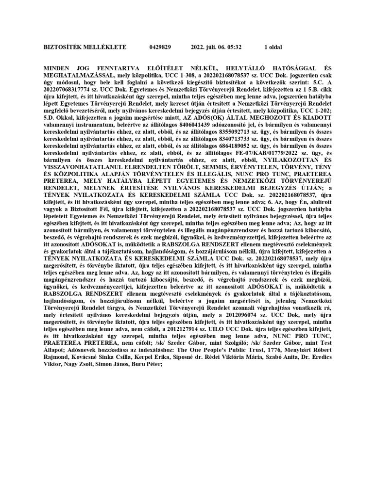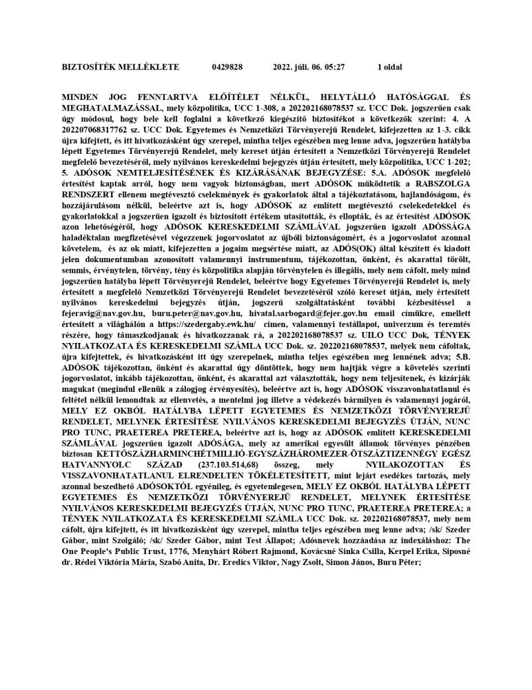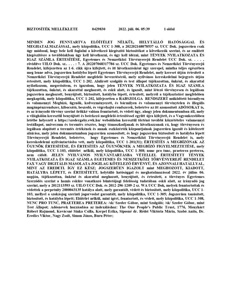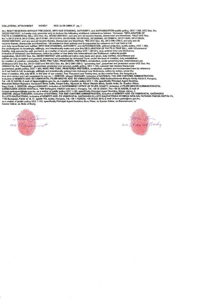 202207068317786 sz. UCC FINANCING STATEMENT AMENDMENT (UCC FINANSZÍROZÁSI NYILATKOZAT MÓDOSÍTÁS) (UCC Dok.), és annak elfogadása ("irányadó jog”: 2012-296-1209-2 sz. WA UCC Dok.: „..Ez az egyetlen elfogadás, amit kap…”), és ezek magyar fordításai: