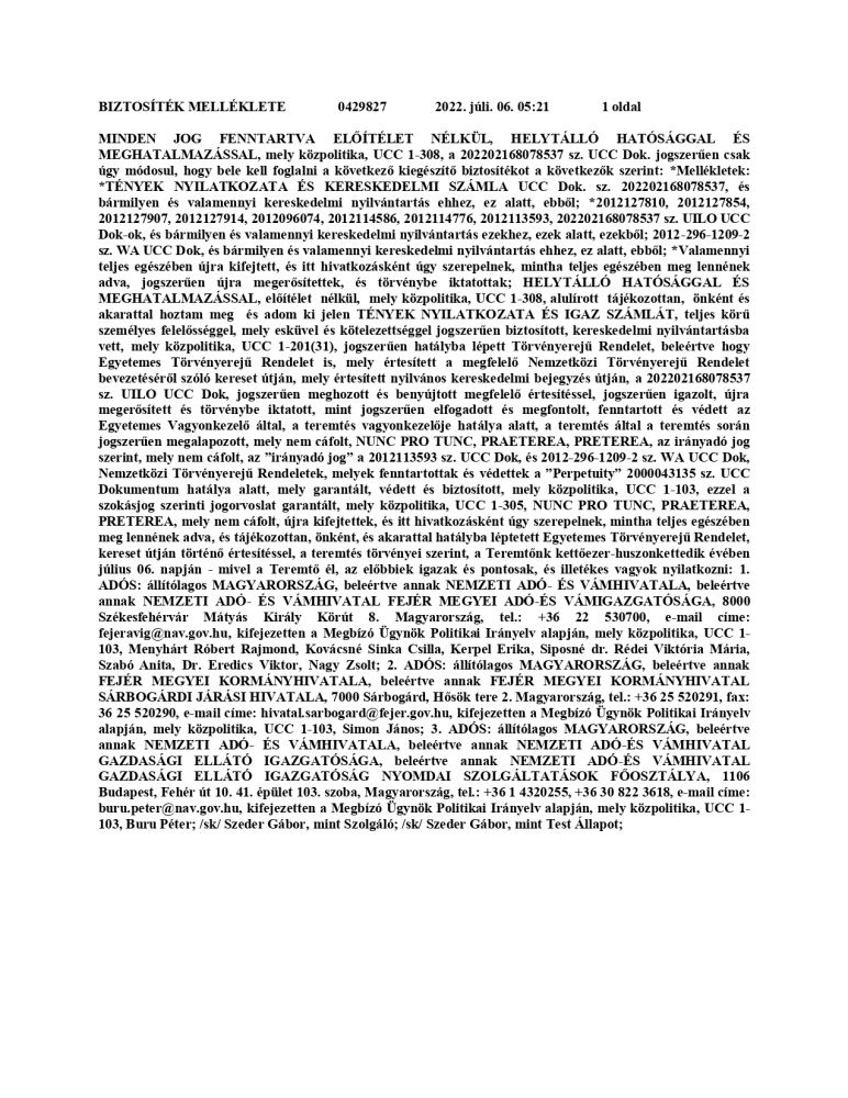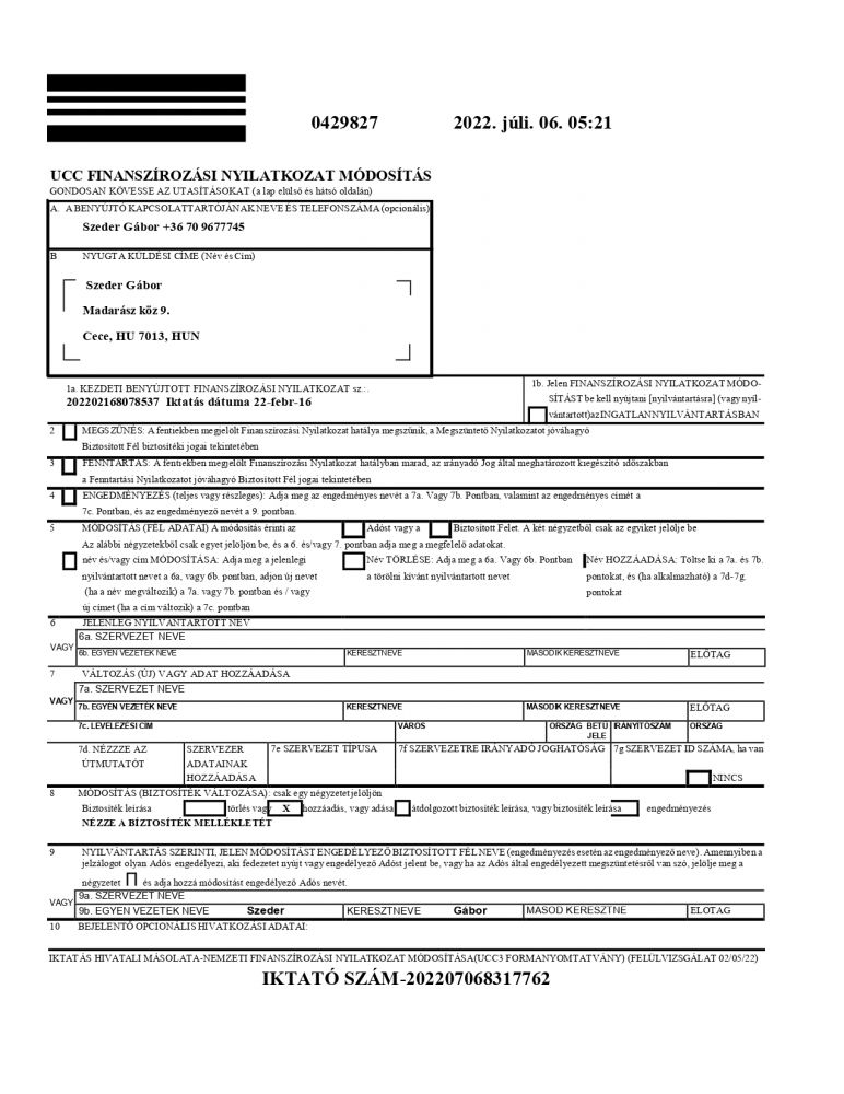202207068317762 sz. UCC FINANCING STATEMENT AMENDMENT (UCC FINANSZÍROZÁSI NYILATKOZAT MÓDOSÍTÁS) (UCC Dok.), és annak elfogadása ("irányadó jog”: 2012-296-1209-2 sz. WA UCC Dok.: „..Ez az egyetlen elfogadás, amit kap…”), és ezek magyar fordításai:
