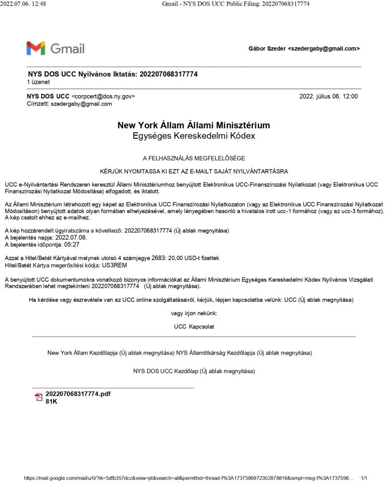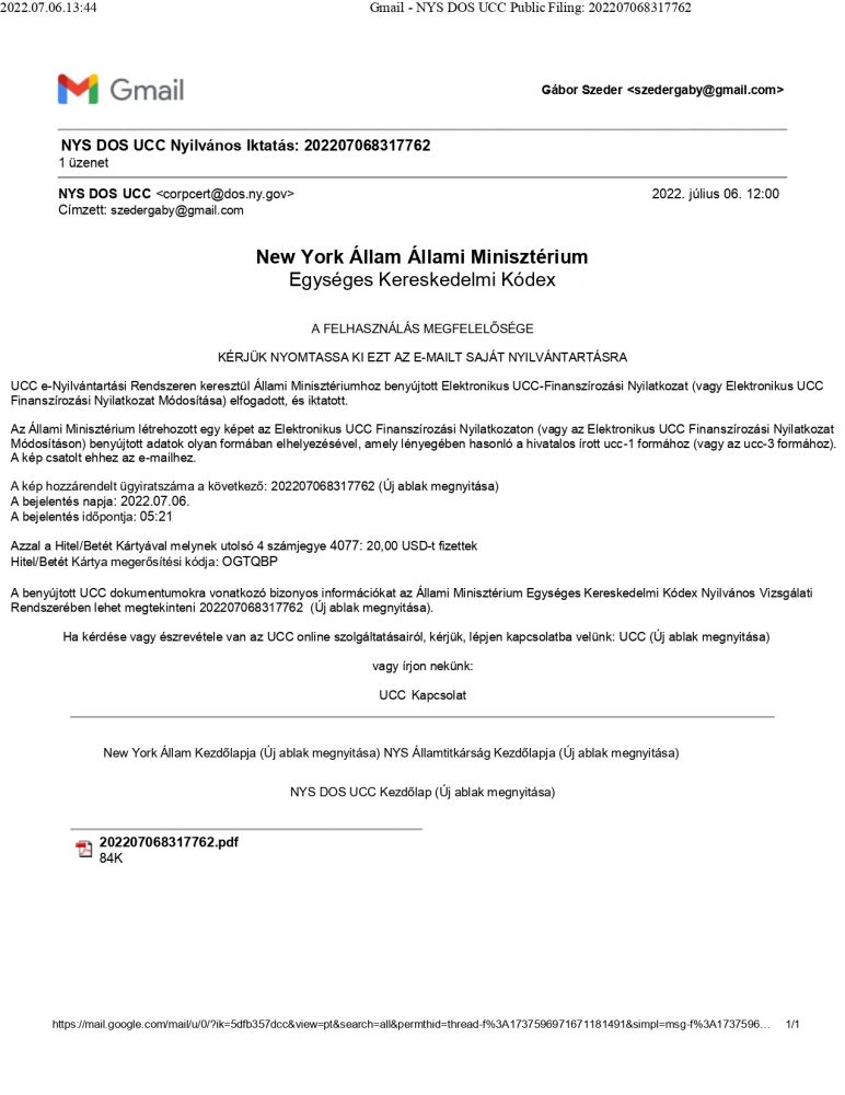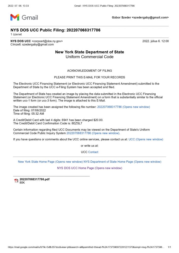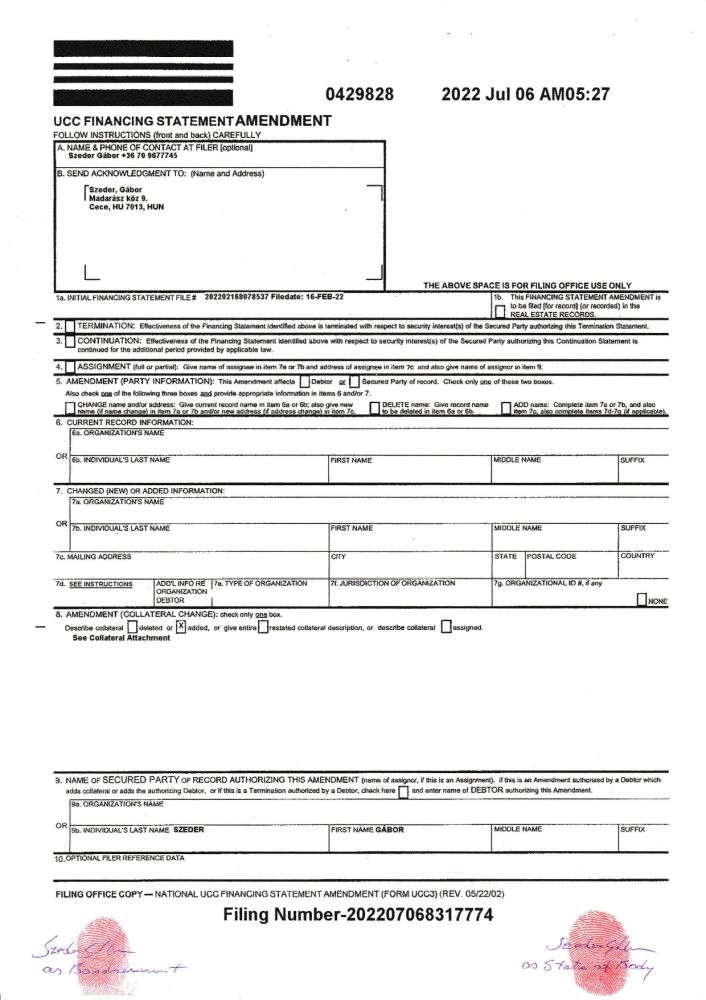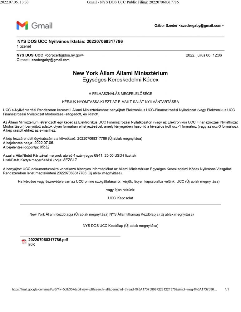 202207068317774 sz. UCC FINANCING STATEMENT AMENDMENT (UCC FINANSZÍROZÁSI NYILATKOZAT MÓDOSÍTÁS) (UCC Dok.), és annak elfogadása ("irányadó jog”: 2012-296-1209-2 sz. WA UCC Dok.: „..Ez az egyetlen elfogadás, amit kap…”), és ezek magyar fordításai: